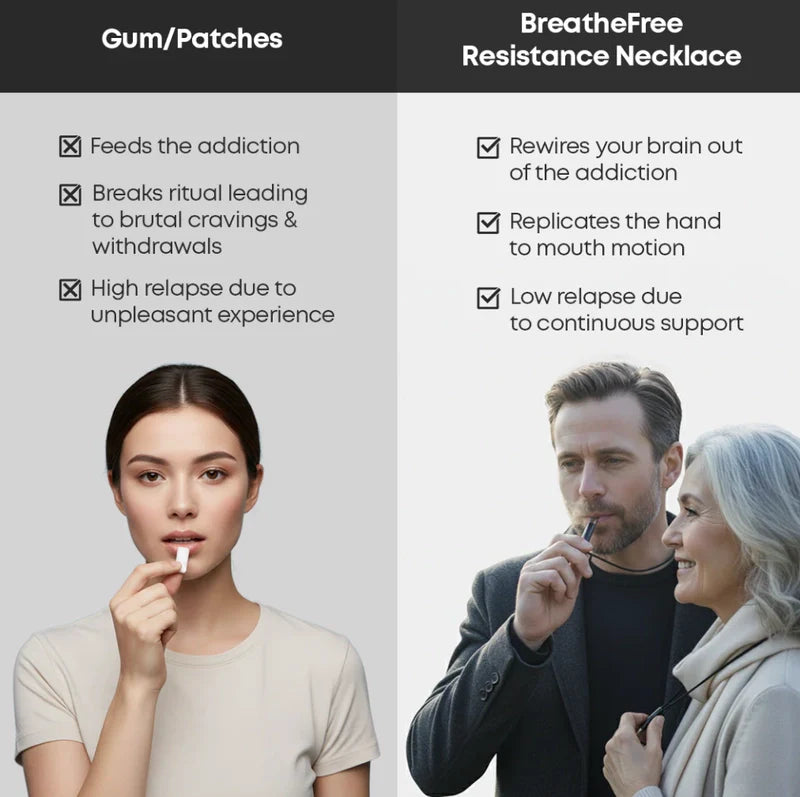 Quitting isn’t just chemical - it’s the habit and hand to mouth ritual your brain has repeated thousands of times. When that ritual is suddenly removed, cravings and withdrawals hit harder. Most quit aids focus on the substance, but ignore the behaviour your brain is wired to expect. The BreathFree resistance necklace is designed to replace the ritual, not the addiction. By recreating the familiar hand to mouth motion and adding gentle breathing resistance, it gives your brain a sense of familiarity - without nicotine, chemicals, or vapor. This helps your brain feel like nothing has suddenly changed, making it easier to step away from nicotine while keeping the feeling your brain is used to.
